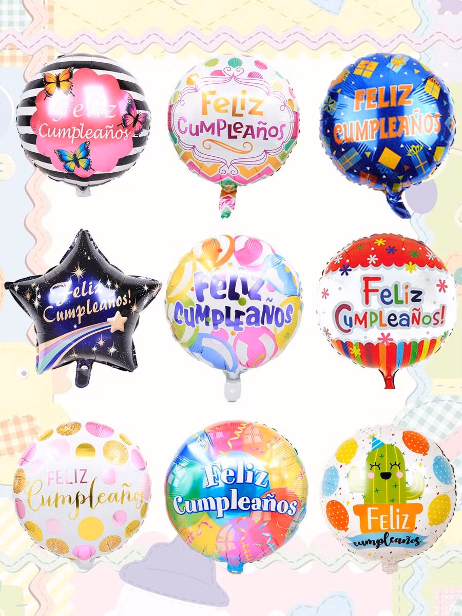 Ett ballongkit med 9 st ballonger med olika motiv. Alla ballonger har texten "Feliz Cumpleaños" och går att fylla med både luft eller helium. Ballongerna blir 45 cm som fullt uppblåsta.