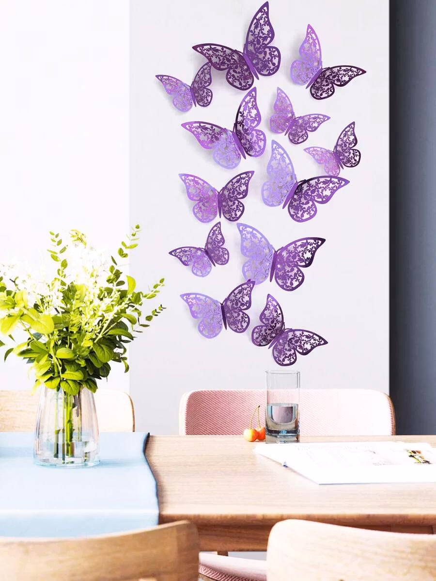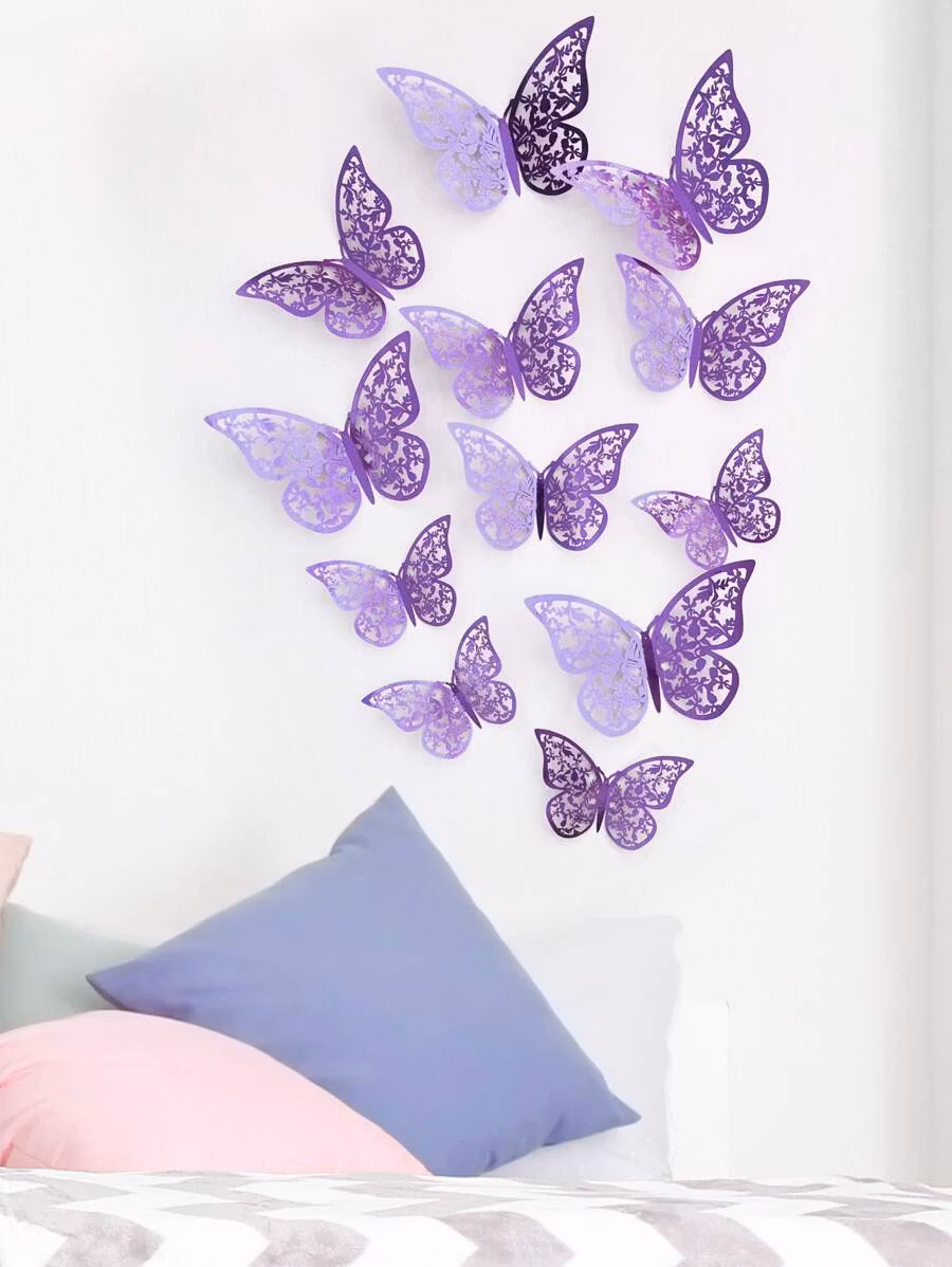 12 st lila fjärilar som går att använda som dekoration i både ballongbågen och som kan fästas på väggen.