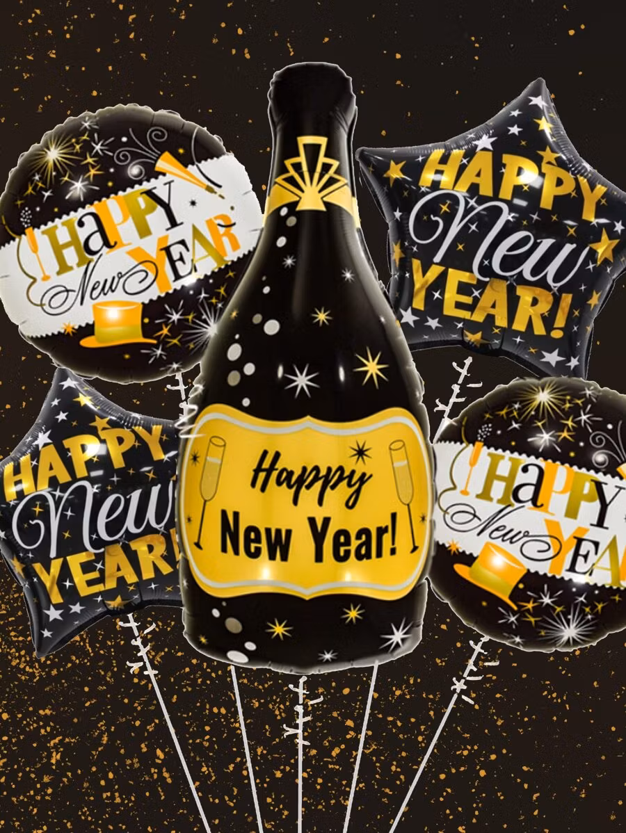 ⭐ Två svarta stjärnformade ballonger – Med "Happy New Year"-text för en gnistrande effekt.