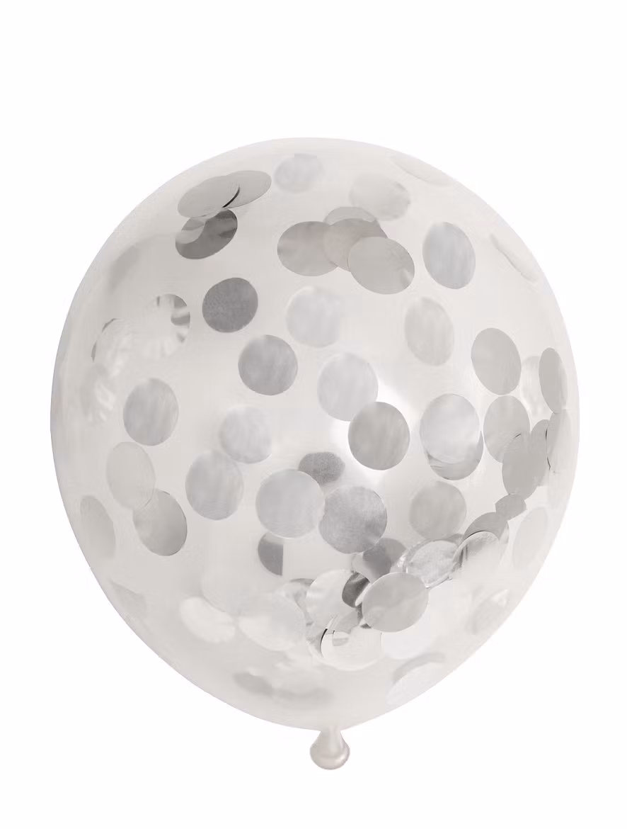 Konfetti ballonger med silver konfetti. Ballongerna går att fylla med både luft eller helium och blir 30 cm som fullt uppblåsta. Kommer i 6-pack.