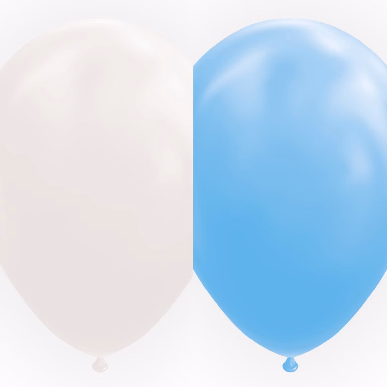 Det perfekta ballongparet, ljusblå och vit. Ballongerna går att fylla med luft eller helium och blir 30 cm som fullt uppblåsta. Kommer i 25-pack.