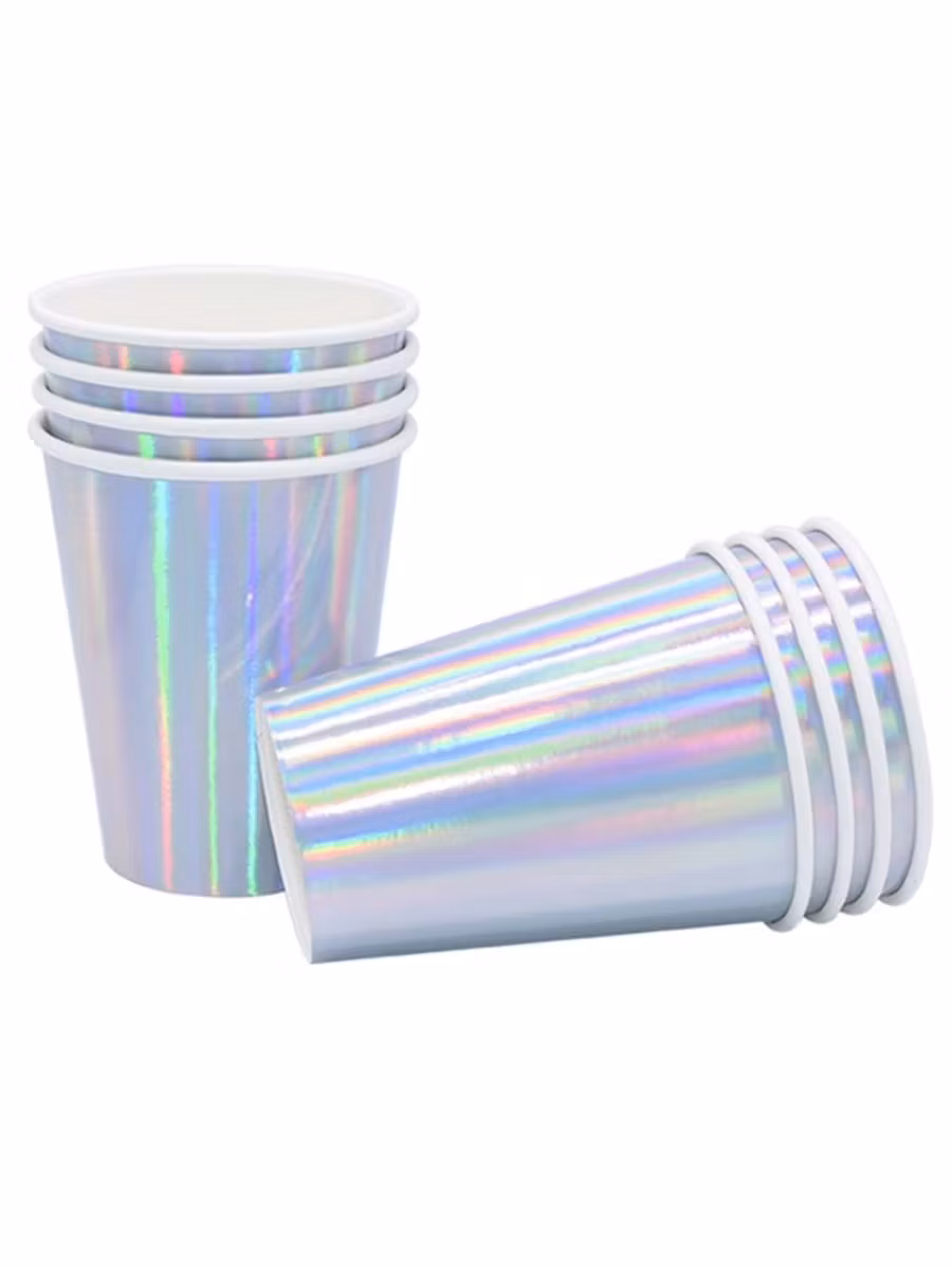 Dessa fina pappersmuggar skimrar i olika färger beroende på vad de reflekteras med. Muggarna är även gjorda av 100% papper och går därför att återvinna direkt efter användning vilket gör att du sparar disk. Pappersmuggarna kommer i 10-pack.