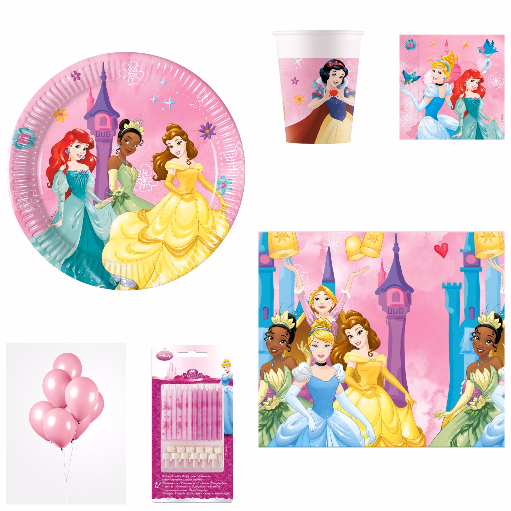 Skapa drömmiga prinsesskalas med vårt färdiga kit! Innehåller rosa ballonger, papperstallrikar, muggar, servetter, bordsduk och prinsess tårtljus. Perfekt för g