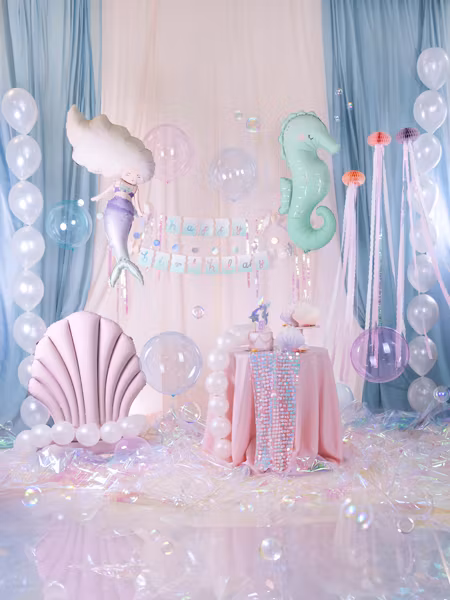 Dyk ner i festligheterna med vår fantastiska snäckballong – ett absolut måste till ditt Mermaid-kalas! Den här vackra snäckan är full av havsmagik och garanterat att göra succé bland alla små sjöjungfruar och havsälskare. När den är fullt uppblåst mäter den storslaget 96 x 80 cm och förvandlar vilken fest som helst till ett undervattsevent fullt av glädje och fantasi!